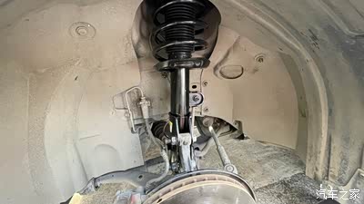 9、拧下将前减振器固定到车身上的3个螺母(第6步那个)。然后使用千斤顶把轮毂顶起来一点,现在可以很轻松拆下前横向稳定杆固定到前减振器的螺母,以及前减振器总成固定到前轮毂上的2个螺栓了。然后,可以拆卸下减震器总成了,特别注意,慢一点,千万不要将ABS线束和制动软管碰到扯坏了。
