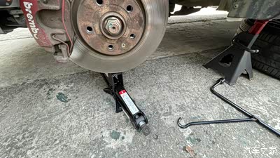 5、将轮胎拆卸下来,并放置于车下(安全考虑),然后使用支撑架将车子支撑,取下千斤顶用于轮毂下面(拆卸减震时必须用千斤顶的,个人的力量是取不下来的)。