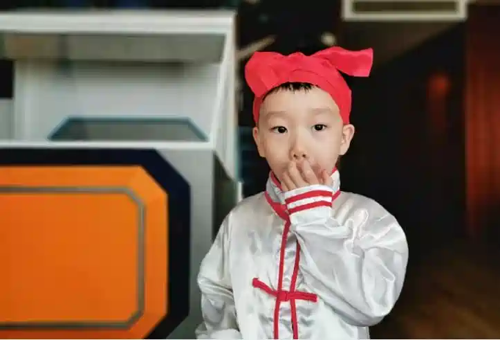 第一次给孩子穿太极服,经验不足,原来红色的那条是腰带,我说怎么不太对呢,越看越像打腰鼓的。