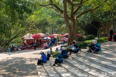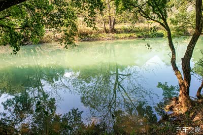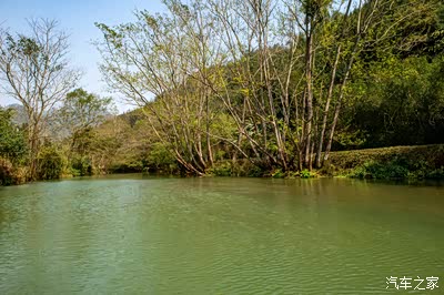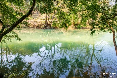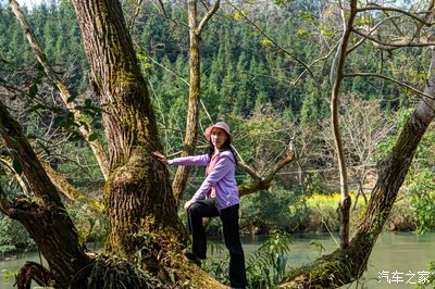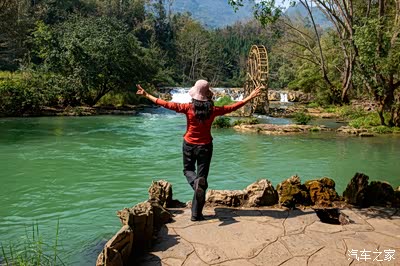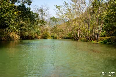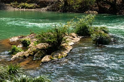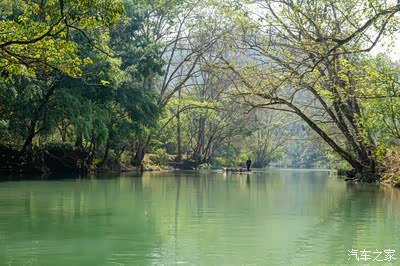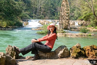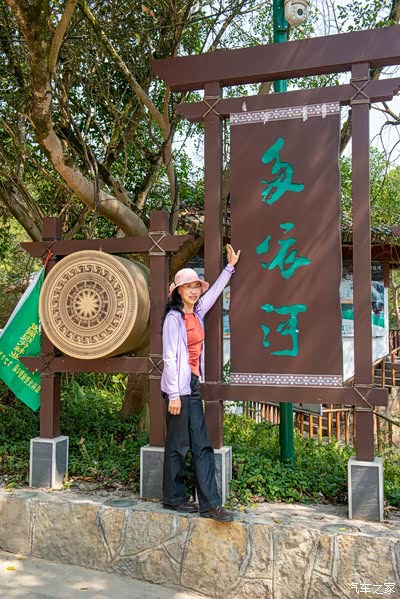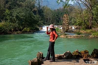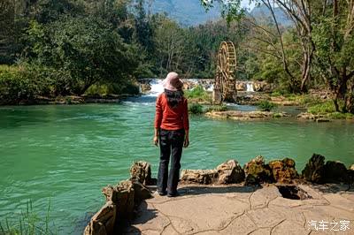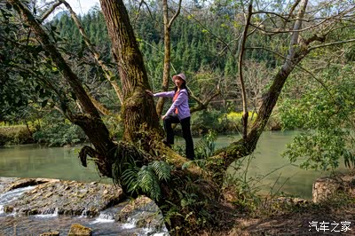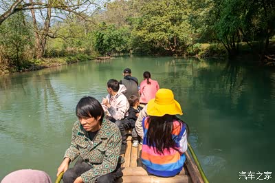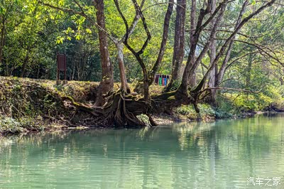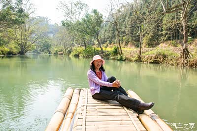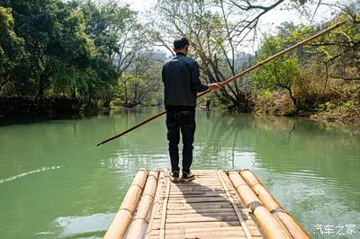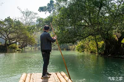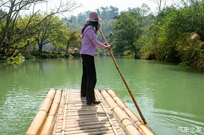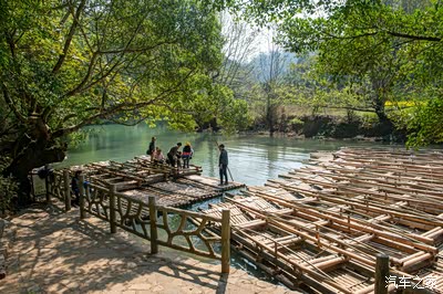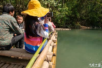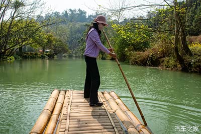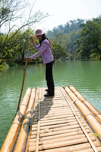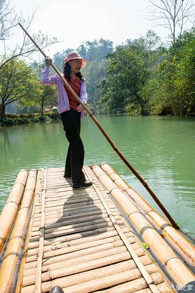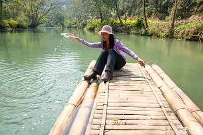 来到多依河景区游客中心,左边是停车场,右边是美食街。高大的树木下,身着民族服装的“大娘”们不时还向游客兜售“纪念品”。走过小桥,正面是景区大门,右边三层楼高的水车慢悠悠的在多依河中旋转着。进入景区,舒缓的多依河,河水清澈透明,我们坐在竹筏上,将手放入多依河水中,一阵凉意涌上心头,大把大把的戏水,不时荡起一团团晶莹的水波,格外清澈。兴奋之余,我老婆手握撑杆左一下、右一下,有模有样的向前撑去。 竹排在河面上划行,沿岸竹林绿树相间,倒影迷人,河边上的高大乔木,造型千奇百怪,盘根错节,一些树根深深插入水中,与水共生长,非常奇妙。