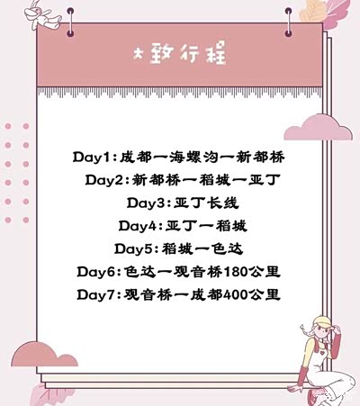 在人的一生中,总要一些地方,偶尔得知,便一生向往。自从电影《从你的全世界路过》里看到了 稻城 的美, 川西 便是我这几年一直向往的地方,那一块受众神祝福的土地,那一片蓝色星球最后的净土,承载着许多的渴望与向往, 川西 大概也是每个旅行者都想抵达的地方。那里似乎天生就适合爱情跟喜欢的人一起去才不负美景。但是有句话说得对,想去的地方就要赶紧去,不要总等着和别人一起,可能最后那个想等的任不在了,想去的地方也没去成。所以这次我果断一个人出发了。这趟旅程总共有七天,我选择了越野拼车,类似于自驾。 确定出发了时间,接下来的日子就要开始做准备了,除了准备高反的药物之外,另外一件大事就是服装,可以让我凹造型的服装,哈哈!
