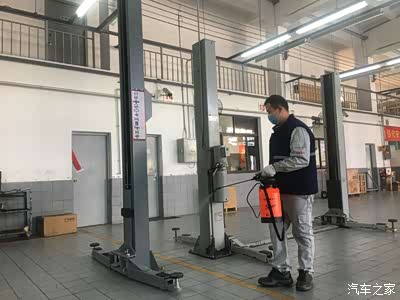 进入保养车间和维修车间,小诺看到,消毒的频率要求和展厅几乎一样,工作人员们紧锣密鼓,车辆到店前先进行一次消毒。每保养离场后,不仅会对客户的车辆进行二次消毒,更会对内场进行二次消毒。