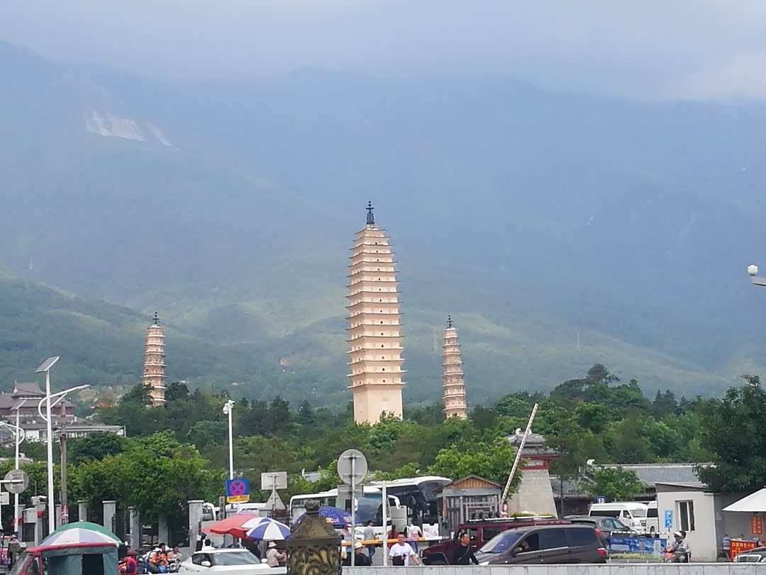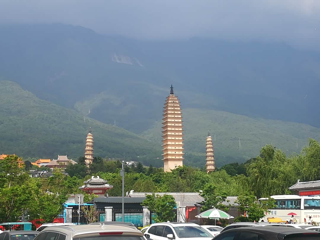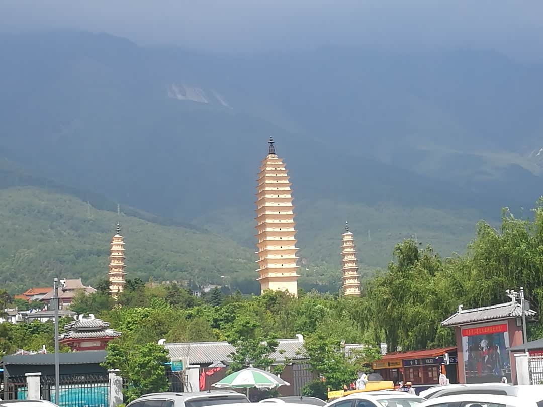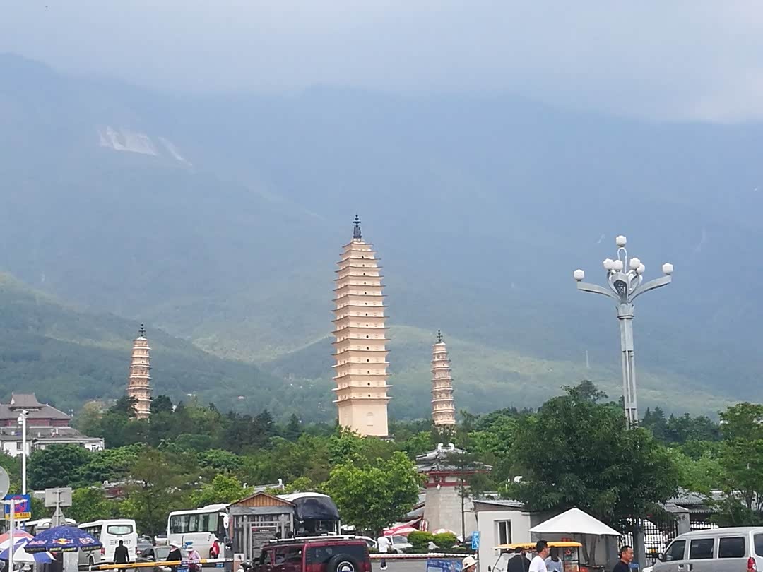 大理崇圣寺三塔位于大理古城西北部1.5公里处,西对苍山应乐峰,东对洱海,距山脚约为1500米。南336米处有桃溪向东流过。北76米处有梅溪,东靠滇藏公路。三塔由一大二小三阁组成。大塔又名千寻塔,当地群众称它为“文笔塔”,通高69.13米,底方9.9米,凡16级,为大理地区典型的密檐式空心四方形砖塔。南北小塔均为十级,高42.17米,为八角形密檐式空心砖塔。三座塔鼎足而立,千寻塔居中,二小塔南北拱卫。
