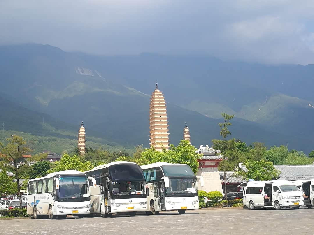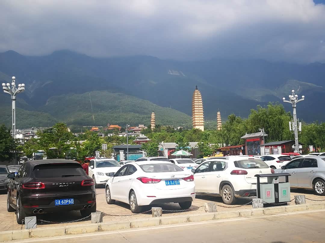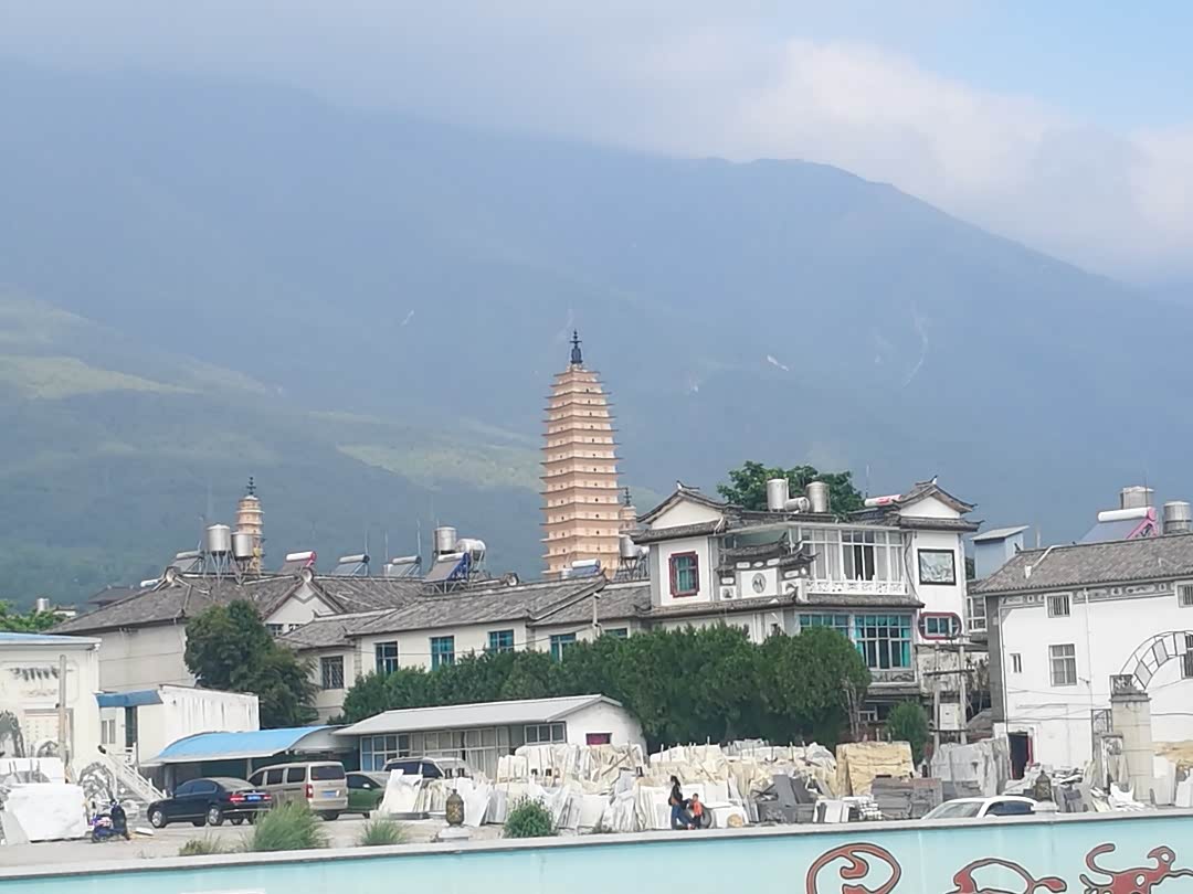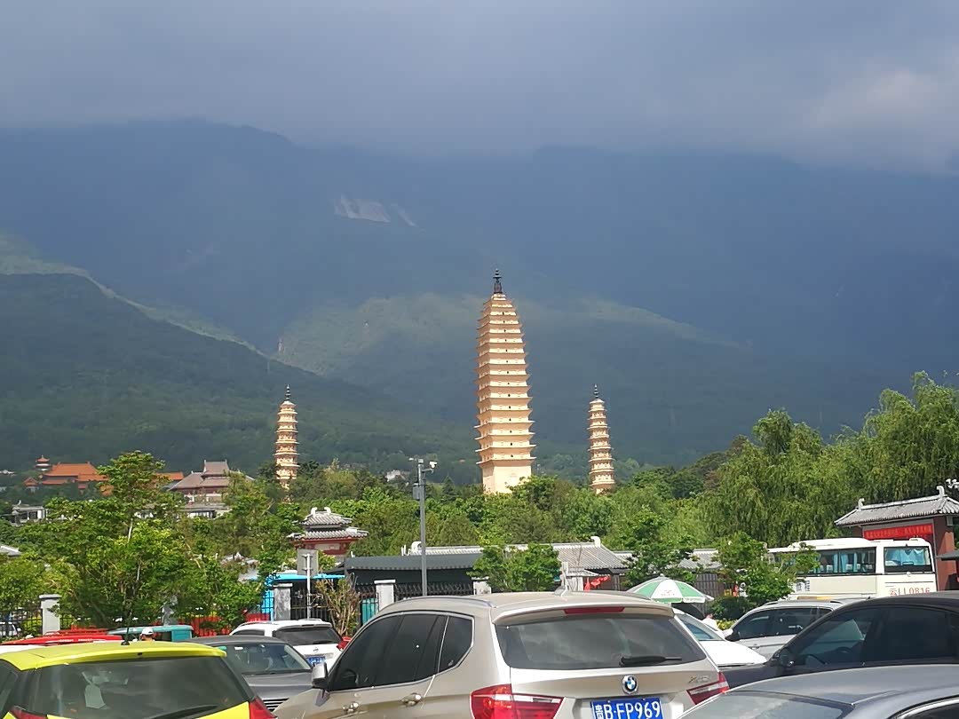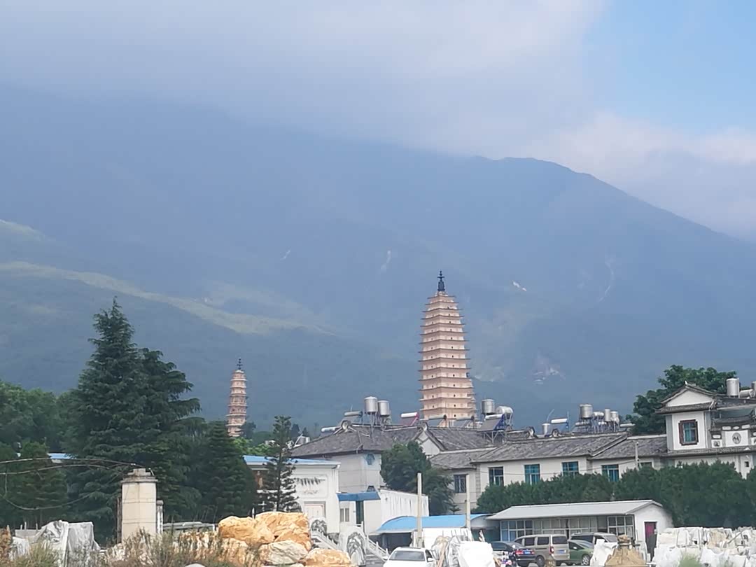 大理崇圣寺三塔位于大理古城西北部1.5公里处,西对苍山应乐峰,东对洱海,距山脚约为1500米。南336米处有桃溪向东流过。北76米处有梅溪,东靠滇藏公路。三塔由一大二小三阁组成。大塔又名千寻塔,当地群众称它为“文笔塔”,通高69.13米,底方9.9米,凡16级,为大理地区典型的密檐式空心四方形砖塔。南北小塔均为十级,高42.17米,为八角形密檐式空心砖塔。三座塔鼎足而立,千寻塔居中,二小塔南北拱卫。