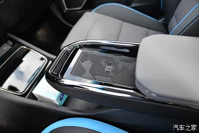 中央扶手采用的是断开式设计,上层专门用来放置手机,同时带有无线充电,下层是带有盖板的放饮料以及其他包、钥匙之类的物品的地方,做到了干湿分离。