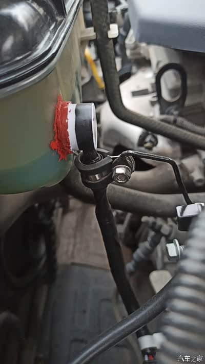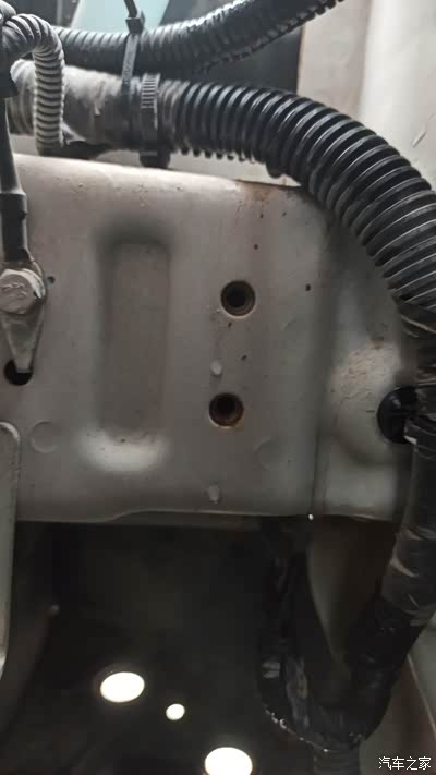 我在发动机舱找位置找了很久,最终在左边纵梁上发现有两个孔,拿螺丝来试了一下,是M6的螺纹孔