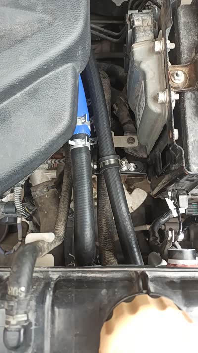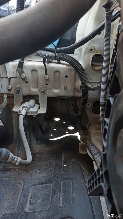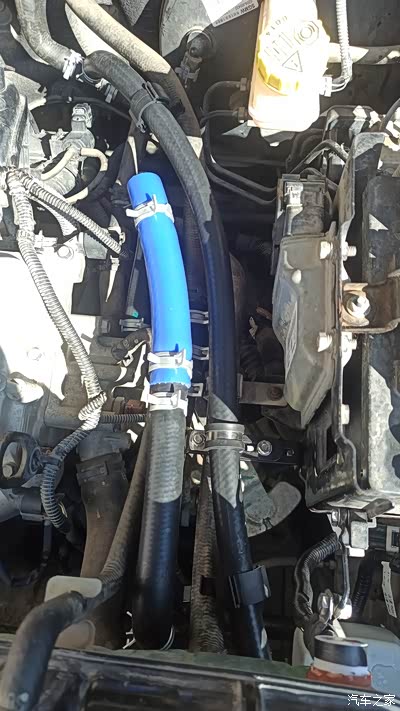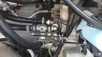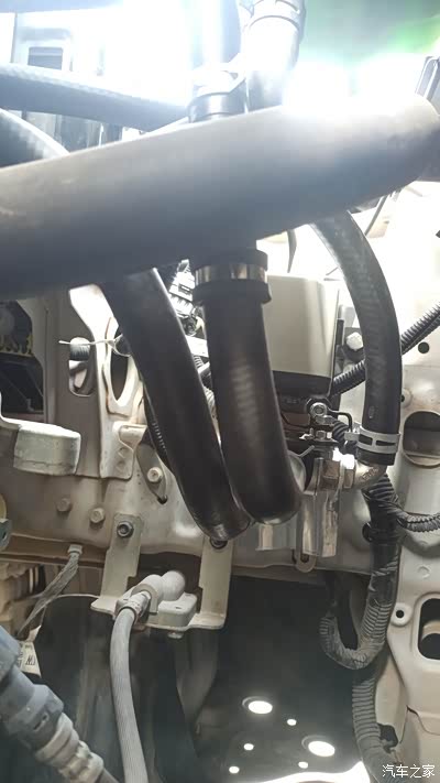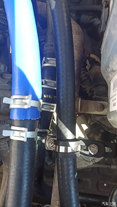 用三根角码和两个R型夹把阀体固定在纵梁上,中间是进水管,前面是回流管,后面接暖风进水管