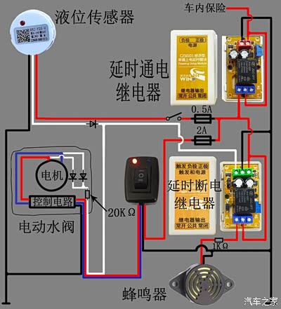 电动水阀的白色电路部分是我自己加装的,用来检测电动水阀电机的工作状态,当电机运行时会向外输出高电平,这个高电平进入延时断电继电器后就会吸合通电,蜂鸣器就发出声音。液位传感器也一样,当检测不到防冻液就会输出高电平,这时蜂鸣器也会出声