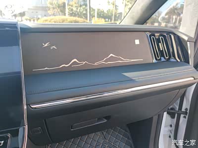外观看完,再来看看内饰把,宗师版最大的改变就是这块很大的中控屏了,在看看我那块挤在出风口的小屏幕,哈哈,而且副驾驶他还设计了一块山水画的板子,不知道是不是实木的,还挺有感觉的,领秀版的就是一块软包的皮子,也还不错,整个中控算是简洁的设计,直接把空调按键都省了,全部在屏幕上操作了,这就是大屏幕的用处吧。