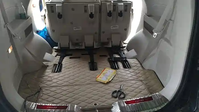 大家看到上图是否跟我一样有疑问,这样改造,第三排收起时滑轨及勾凸起,造成后箱地面不平,若放货就不方便了(这是商务车,谁让你用来拉货的