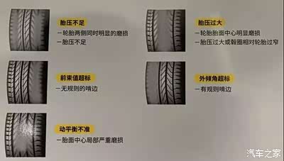 轮胎中的气压,就像橡皮气球一样,会慢慢的透过轮胎的橡胶表层泄露出去。所以要对轮胎进行定期的胎压点检。轮胎的气压要在车辆停放后等到轮胎温度降下来后调整。如果胎压太低,轮胎在转动时的变形量大,轮胎的橡胶会异常发热。特别是在高速行驶时,轮胎会产生破裂,所以在高速行驶前请先确认轮胎的气压。如果气压太高,轮胎的柔软性受损,不但会影响乘坐的舒适性,还会使轮胎的中部磨损。