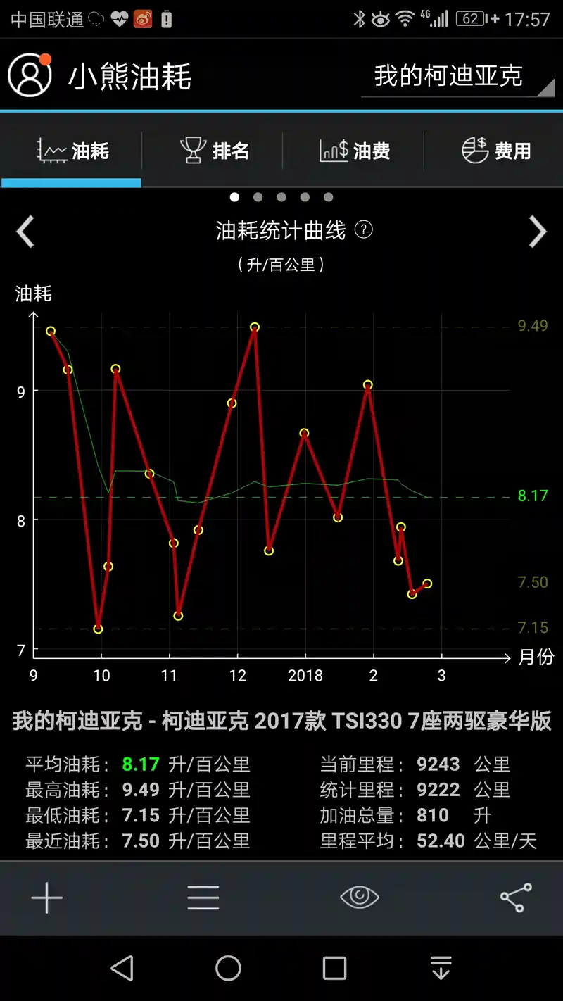 截止目前的油耗,深圳算是比较拥堵的城市,但是深圳快速路多,平常开车上下班少,周末和节假日开车较多,整体油耗满意