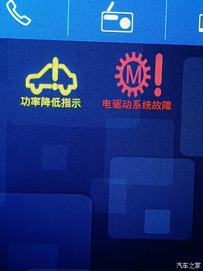 第一种情况,失去动力以后,车子就出于空档滑行状态,可以慢慢滑到路边。停车,拔钥匙,过个半分钟左右,再重新启动,就可以走了。但是这种情况存在一定的安全隐患,特别是家里其他人开的时候,会手忙脚乱。这个时候,车子大屏会显示故障是“电驱动系统故障”。