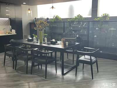 餐台和琳琅满目的领克周边展品,餐台上花瓶中的花经过了精心的修剪,摆放的桌品创意满满