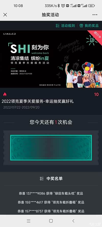 领克汽车虽然是国产品牌,服务和质量不输于那些大品牌,作为一名领克车主感到十分的自豪。希望领克汽车持续推出这种夏季关爱服务活动,并加大推广力度,让更多的领克车主享受到这么好的高品质活动,即享受免费检测,又有美食、饮品,更有机会中奖。