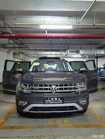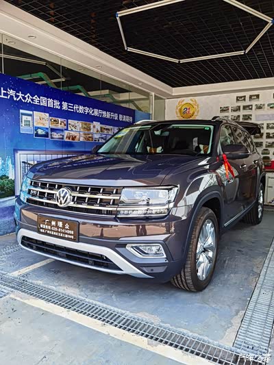 配置,动力,空间都符合我要求,那就差价格了。因为,刚好遇到途昂官方统一下调售价,所以车价直接就较之前降了差不多5w,然后店里再优惠3.3w,落地报价差不多49w。这价格稍微有点超过我的预算,所以回家先商量一下。谁知道当天晚上销售来信息,说展厅里的黑色顶配被企业买走了,目前就剩一台天鹅绒棕色在路上,要一周多才到店。除了这家店,我还看过广州别的两家店,530顶配全都没有现车,需要订车,最起码要等2个月。所以家里商量过后,两天后再到店里看了一下棕色到底是怎么样的,然后再和销售砍了半天价,最后,在送膜、行车记录仪、头枕、灭火器、踏板和6次保养的情况下(本来还想再要求送点别的,但因为顶配,实在找不到能加的配置了),以落地47w3签下了购车订单,付了1w的订金,车到店验车后付尾款。