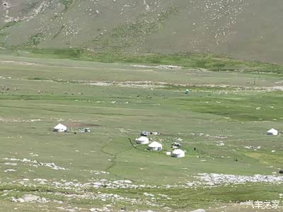 车辆行驶在盘山路上,远处山谷里白色的蒙古包点缀在草地上。