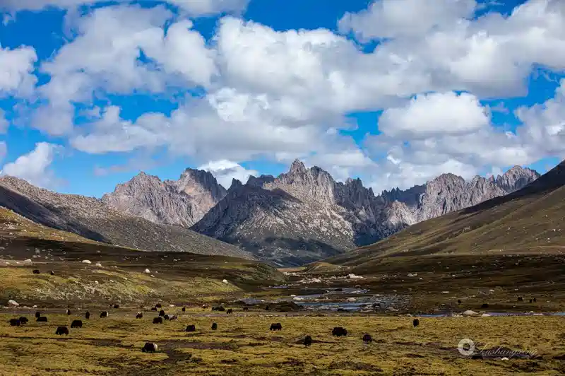 温泉泡了继续前行,这里就是冬鄂错,前面的山就是年宝玉则的核心,沿着小路是可以徒步到莲宝叶则景区里的。