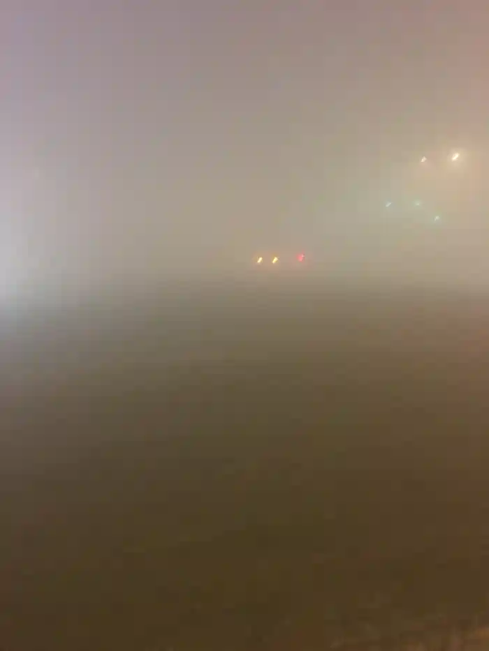 这就是昨夜沈阳市气象局报道的沈阳出现能见度小于50米的强浓雾天气,气象台于19时47分发布大雾红色预警。楼主预估这能见度也就5-10米吧!
