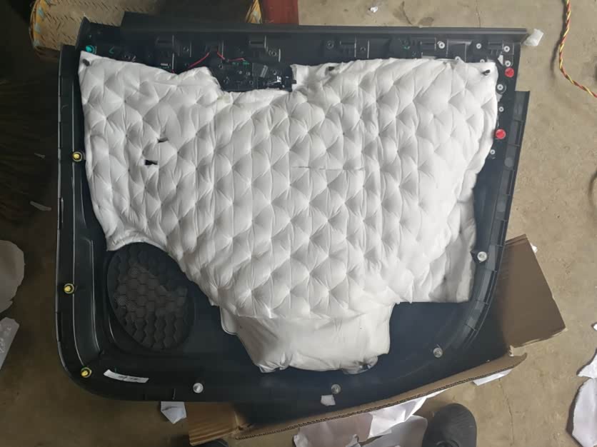 里面一开始我贴的比较密后来感觉有低频噪音比较大就又取了一些止震板出来。拆开门板还准备换喇叭的但听说影响主动降噪就没有换了,但门板都拆开了就想这把自动折耳也加了。本来想把升窗和折耳模块一起安的,但有的网友说安了自动升窗可能会锁车门时出故障,有可能锁不上车门所以犹豫再三决定只安自动折耳,不安自动升窗。