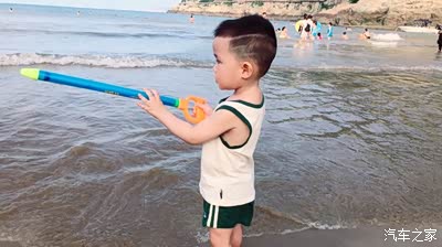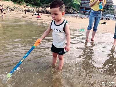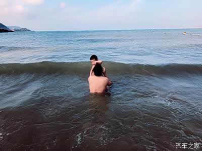 小伙子被爸爸带进大海了,听说,夏天海水泡泡,身上的蚊虫叮咬都不会痒了