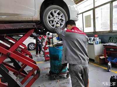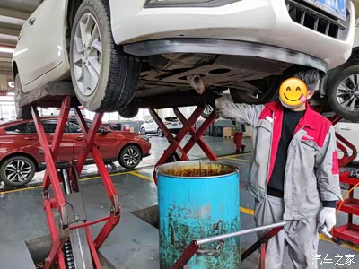 师傅用机器把车子升起来,说要准备换机油,顺便看看底盘的情况。