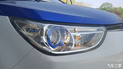 前大灯整体造型凌厉,蓝色的大灯装饰圈很有天使眼的效果,并且灯腔内的BJEV蓝色LOGO更凸显品牌品质。