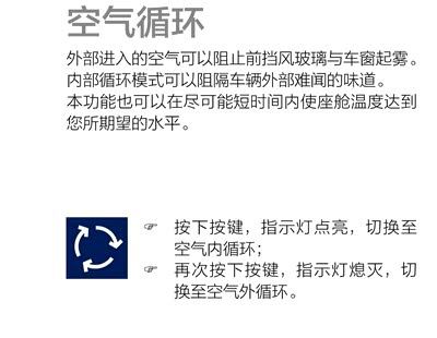 什么时候使用外循环呢?需要改善车内空气质量时。我们在什么比如空气好点的地方,想呼吸点外界新鲜空气时候,又或者你的车时新车,需要经常把车里的甲醛、苯这些有害物质对流出去,这些情况你可以打开外循环的,改善一下车内空气质量。下雨天挡风玻璃除雾时。下雨天的时候,一般我们的前挡玻璃容易起雾,这是因为车里面和外面的温度不一样,车子里面湿度也相对会比较大,那么温差加上湿度,就会产生起雾。