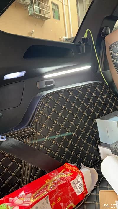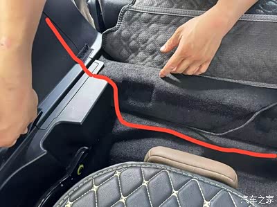 3,把线束的其余部分从灯口塞进饰板,并向前布线,到达饰板最前方后继续沿着饰板向下走,穿出饰板沿二排座椅下方向右侧隐藏走线,到达右侧后像左侧一样把线束末端塞进饰板里。