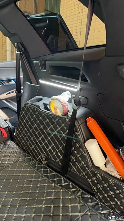 4,翘板伸进尾箱左侧的上饰板的下边沿缝隙里,撬开一点缝隙后,手持灯上的卡子依次把两个卡到饰板上,把灯插头和线束插头对插,塞回饰板。