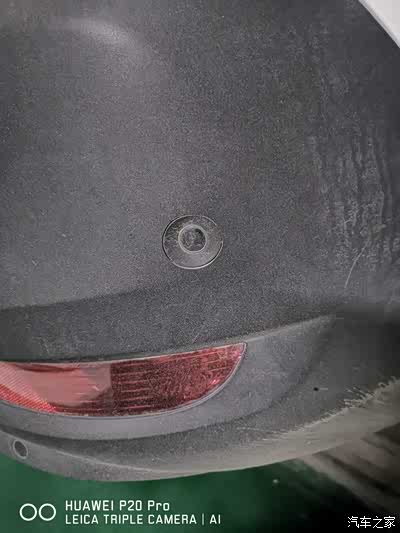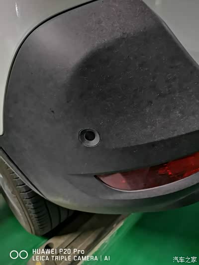 这是后保险杠上自己加的后盲点雷达探头,由于这个有一定倾斜度,所以是不规则的椭圆形,但打孔机是圆的,没办法,只有打完孔后用矬子一点一点磨成椭圆的,效果还可以