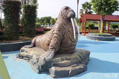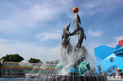门口有个小喷泉,海豚“跃”出水面,顶着它们最爱的“玩具”