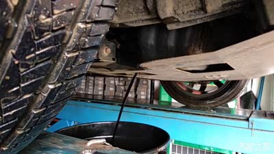 拉个桶过来,用把螺丝扳手直接拧开,正在放机油,这样看蛮黑了,该换了