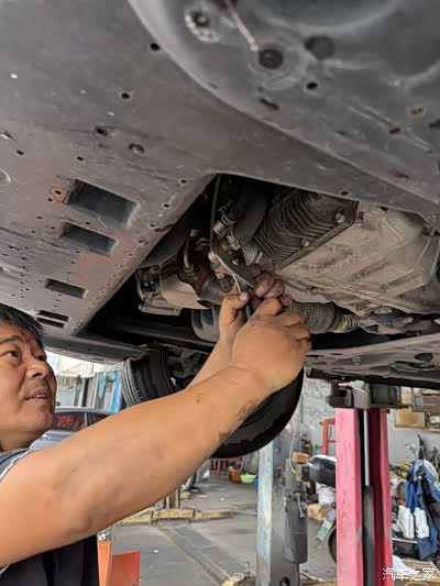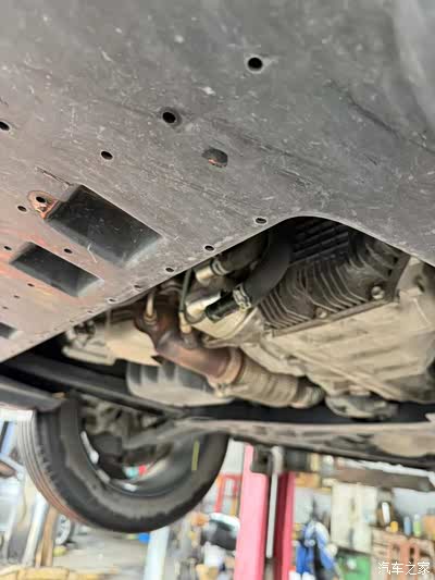 这次拆下面,发现以前装的发动机防护板没有装好,钢板前面的挂钩就没挂上,而是整体搭在前板子 上面的,小店太不负责了