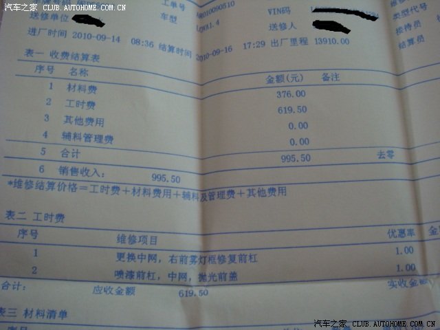9月16日出险一次,维修前保险杠,花了RMB995.50元。保险出。但保险杠还没有修好,没时间去弄,有空再去免费修补。后来又出了一次险,对方全赔,钱拿来了,我还没有去修,也是没有时间修,因此我的乐乐现在有三个地方有外伤。