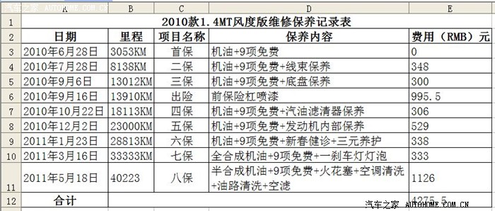 2010款新乐风40223公里迎来第八次保养,前几次保养费用及油耗