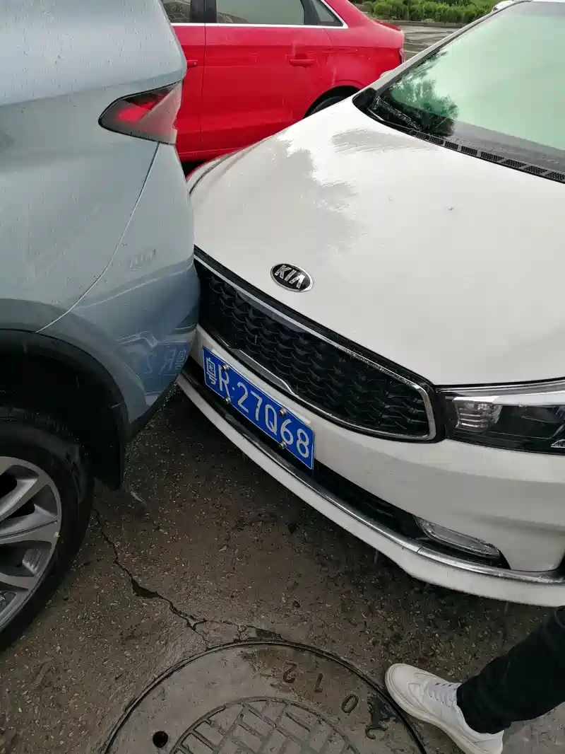 碰撞现场照片,相撞的地方是车身下半部分,没有撞到车灯,而且只是轻轻一碰,以至于后车车主都不知道有碰撞