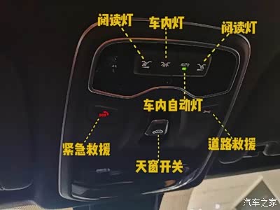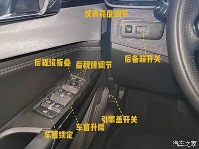 3、天窗及主驾驶左边按键说明:天窗按钮车内照明灯控制及天窗控制,仪表盘及车机屏幕亮度控制及后尾箱开关;
