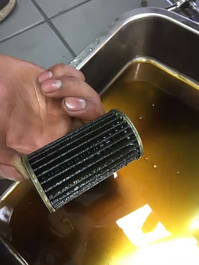 拆完油底壳之后,下一个就是换滤芯了,在这里要特别说明一下,这个车有两个滤芯,一个是内滤芯,一个是外滤芯。内滤芯需要拆掉油底壳之后拿下。外滤芯是在外面,需要拆掉前轮才能看到。这个也是找了好久没有找到,问了淘宝老板才找到的。