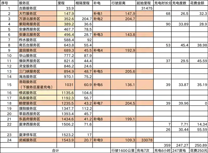 从重庆到河北老家,全程1600公里,我走之前提前规划了沿途的充电站,预计跑个200公里就补次能,实际充了7次,用时6个小时;一共充了247度电,总费用250元(有一次超充没花钱)。价格还是很香的,就是确实费时间。但是这也强制驾驶员,每隔几小时就休息下,因为得充电了,所以跑起来也不会特别累。