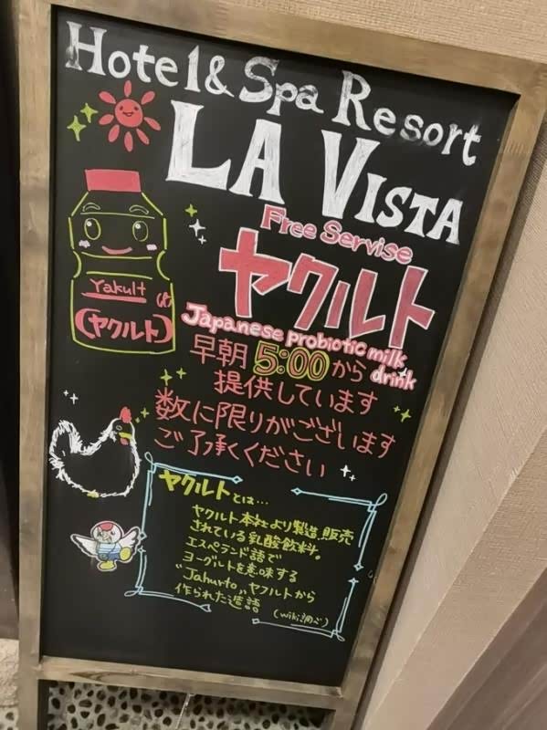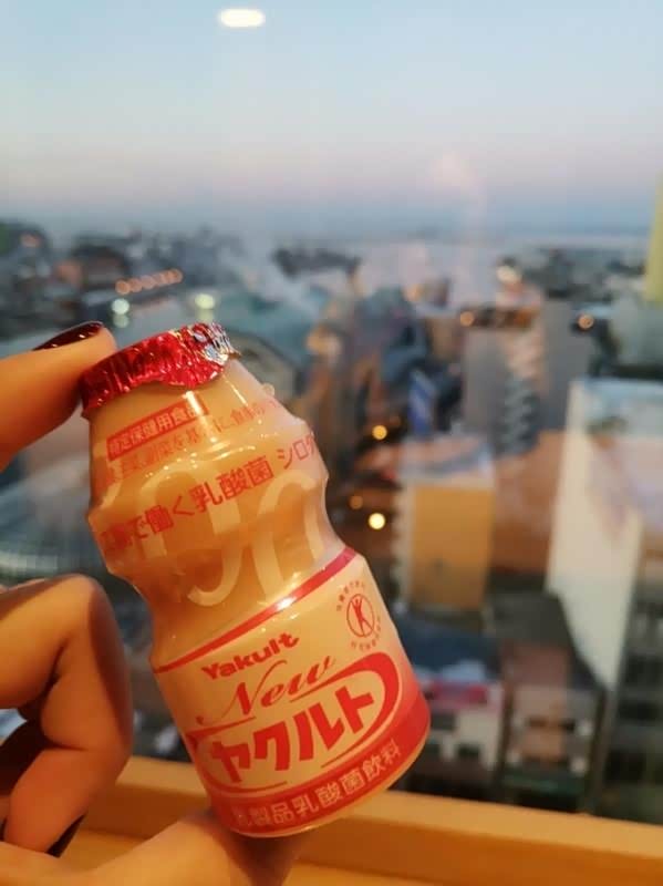 温泉后可以喝酒店免费特供的益力多,再来一瓶酸奶更完美。酒店的大玻璃看出去就是币舞桥,早上起床可以看到日出。
