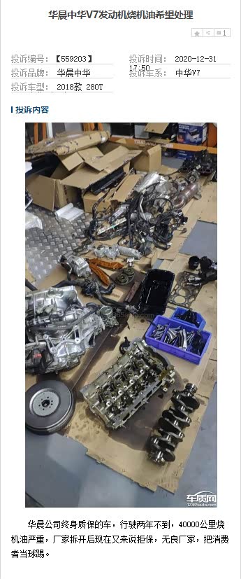 中华V7烧机油不?车质网有一单4W公里烧机油