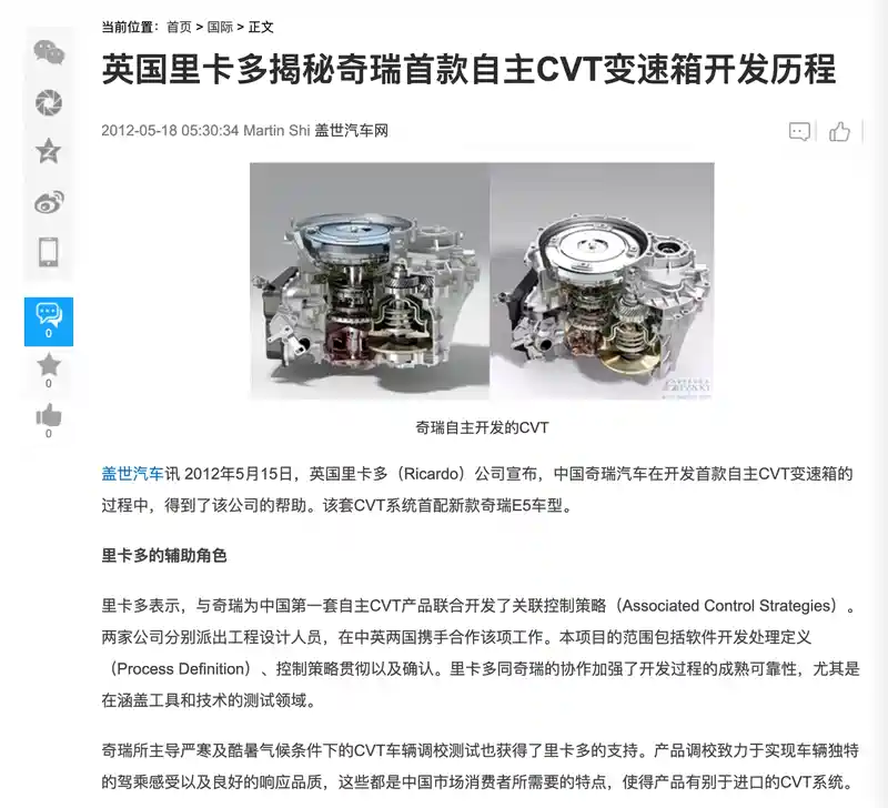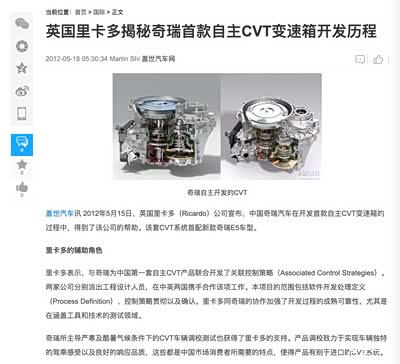 下面是一篇早年的报道,可以大体了解一下奇瑞的CVT变速箱的技术来源,作为外方,英国里卡多确实也贡献了一臂之力。