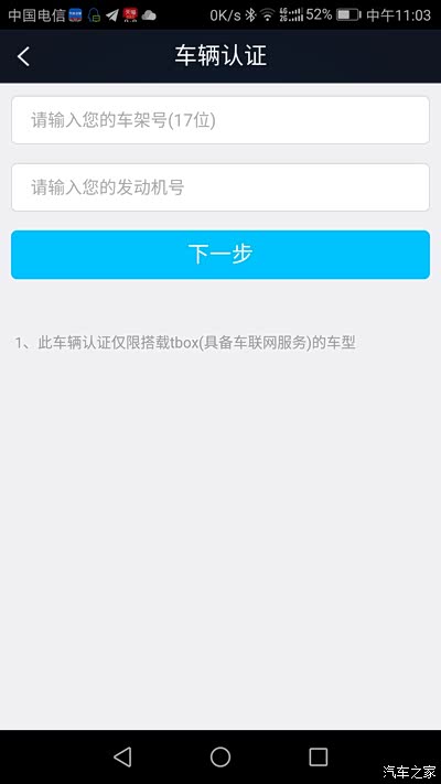 输入车架号,和发动机号 然后下一步