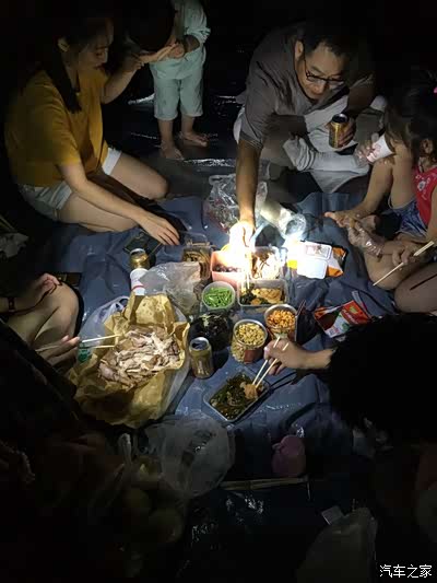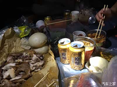 太阳一落山,天就黑的特别快。帐篷刚搭好天就黑了,大伙带着各自 的美食聚在一起哈啤起来。