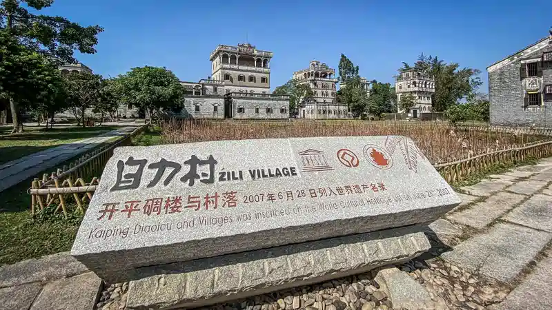 自力村是开平碉楼与村落的典型代表,自然环境优美,荷塘、瓜地、菜园、果树散布其间,与十五座仍保存完好、风格各异、造型独特的碉楼相映成趣,景色美不胜收。村落布局和谐,中有石板铺砌的阡陌小路相通,高大坚固、历经沧桑的碉楼在建筑上配备了钢窗、枪眼等防卫功能,装饰上充分融合了罗马式、哥特式、巴洛克式等欧美风格。