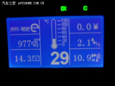 打着火了发动机转速977转,电压14.3V,怠速油耗2.1个,今天下午安装好以后跑了一趟10.9是历史油耗,刚打着火发动机温度低,发动机状态显示是开环驾驶,水温成29了,右上角是输入油价计算价格的,显示跑的路所花的油钱,