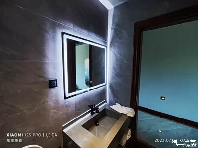 卫生间洗脸池和镜子,镜子灯开关是触摸式的,在镜子底部中间位置蓝色的。