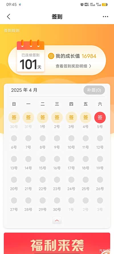 提车时,工作人员说在app里“我的”右上角持续签到,积累-我的成长值,可以兑换大通宝,用于维保时使用,开始老是忘记,后来一坚持就是一百天有余了。把app放在和常用微信的界面挨着,基本就忘不了了。
