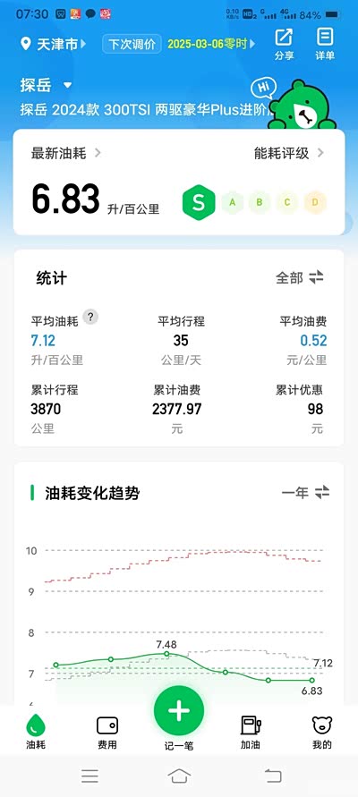 以前在长下坡路,油耗2个3个也是出现过的,这种就不作为参考了。当然市区的油耗就一般了,我用了半年的小熊油耗,将时速油耗对应关系大致总结如下